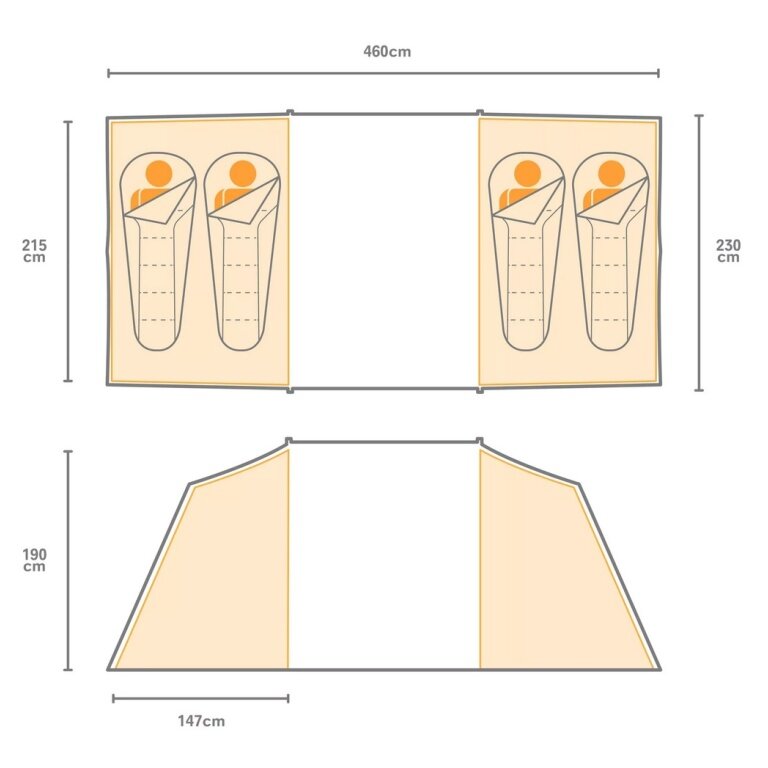 • zelt für 4 Personen mit geräumigem Bereich in der Mitte sowie je zwei Schlafbereichen auf jeder Seite