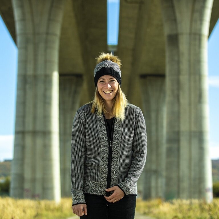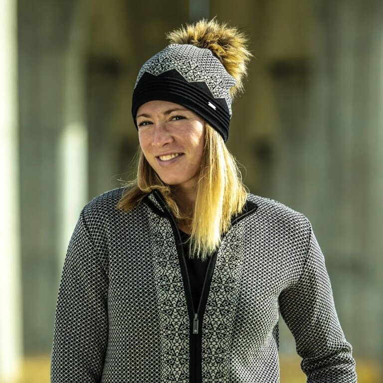 • damenmütze für die Stadt und auf die Piste mit Fütterung aus einem feinen Fleecestoff mit einem filigranen Muster, das von einer großen Bommel aus Kunstfell ergänzt wird.
