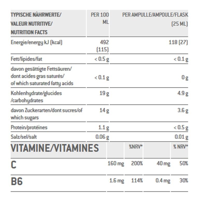 : Wasser, Fructose, Orangensaftkonzentrat, Magnesiumcitrat, Säuerungsmittel (Milchsäure, Ascorbinsäure), Stabilisator Glycerin, Magnesiumbisglycinat, Vitamine (Natriumascorbat, Pyridoxinhydrochlorid), Konservierungsstoff Kaliumsorbat, Süssungsmittel (Steviolglykoside, Sucralose, Natriumsaccharin), Aroma
