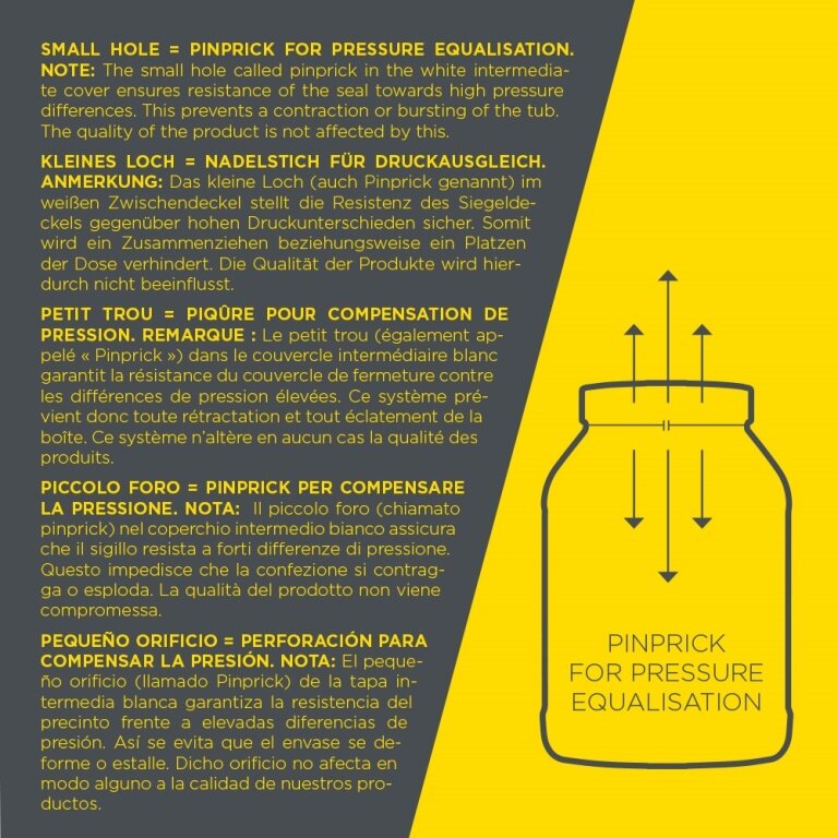 • dieses Loch ist notwendig um durch den Druckausgleich während des Transportes ein Verformen der Dose zu verhindern und schränkt die Qualität unserer Produkte in keiner Weise ein