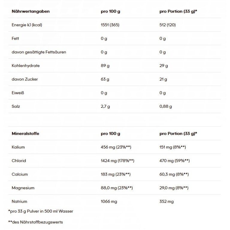 • Zutaten: Dextrose, Maltodextrin, Fruktose, Mineralstoffe (Natriumcitrat, Natriumchlorid, Calciumlactat, Kaliumchlorid, Magnesiumcarbonat), Säureregulator (Citronensäure), natürliches Zitronenaroma, Frucht- und Pflanzenkonzentrate (Färberdistel, Zitrone)