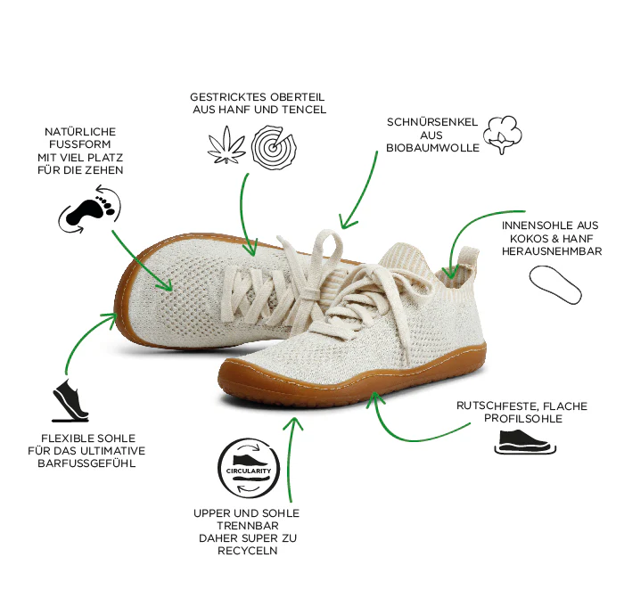 das Ergebnis ist ein sockenähnliches Obermaterial, das sich dem Fuß perfekt anpasst und ein flexibles, leichtes Gehen mit rein natürlichen Materialien - Hanf und Tencel - ermöglicht.