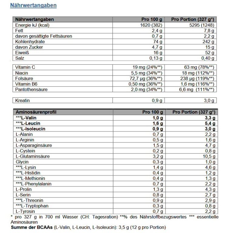 • Jede Portion enthält dabei 52 g qualitativ hochwertiges Protein, inklusive natürlich enthaltener 11 – 12 g BCAAs + 3 g Kreatin und liefert, je nach Geschmack, bis zu 243 g Kohlenhydrate - und das sogar zuckerarm*