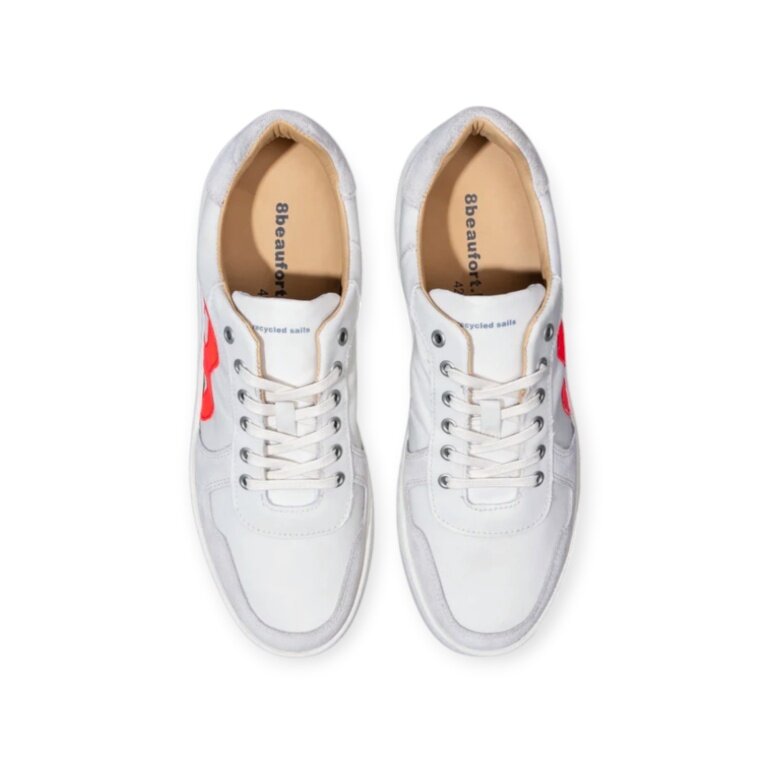 - weißer Sneaker von 8beaufort.Hamburg, gefertigt aus recyceltem Segeltuch, mit Innenfutter aus vegetabil und chromfrei gegerbtem Leder und Baumwolle.