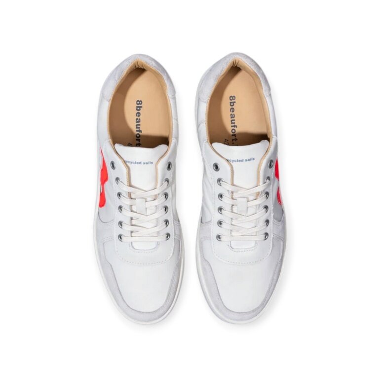 • weißer Sneaker von 8beaufort.Hamburg, gefertigt aus recyceltem Segeltuch, mit Innenfutter aus vegetabil und chromfrei gegerbtem Leder und Baumwolle.