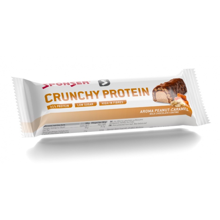 Sponser Crunchy Protein Riegel (über 30% Proteinanteil, nur 1,8g Zucker pro Riegel) Erdnuss/Karamell 12x50g Box