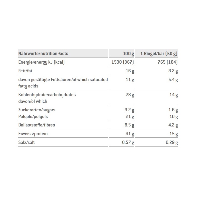 • Zutaten: Milchschokoladenüberzug mit Süssungsmittel 31% (Süssungsmittel Maltit, Kakaobutter, Vollmilchpulver, Kakaomasse, Emulgator Sojalecithin, Aroma), Karamell-Schicht 18% (Polydextrose [Nahrungsfaser], Kondensmilch, Kakaobutter,  Feuchthaltemittel Sorbit, Emulgator Mono- und Diglyceride von Speisefettsäuren, Aroma,  Speisesalz, Farbstoff Zuckerkulör), Milchprotein, Kollagenhydrolysat, Soja-Crispies 9% (Sojaprotein, Reismehl, Gerstenmalzextrakt, Speisesalz), Feuchthaltemittel Glycerin, Sojaprotein, Kokosfett, Aroma, fettarmes Kakaopulver, Sonnenblumenöl. Kann Spuren von Ei, Nüssen und Erdnüssen enthalten