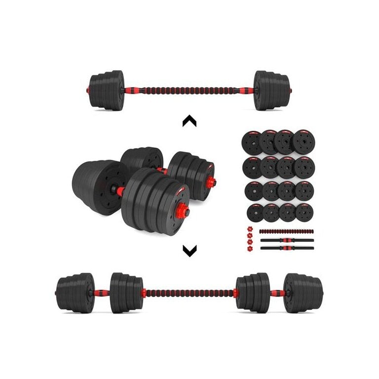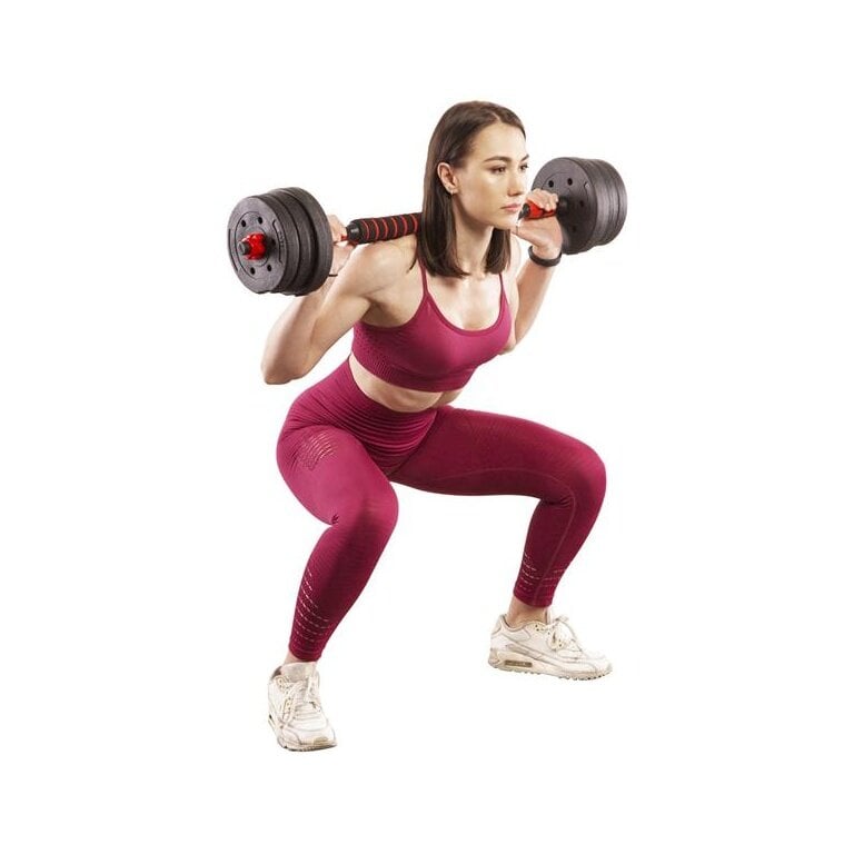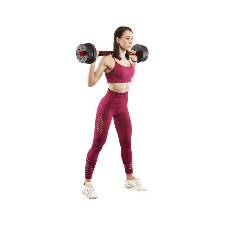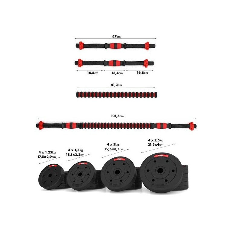 - das Set umfasst zwei Hantelstangen, vier Verschlüsse, Verbindungselement und insgesamt 16 Hantelscheiben