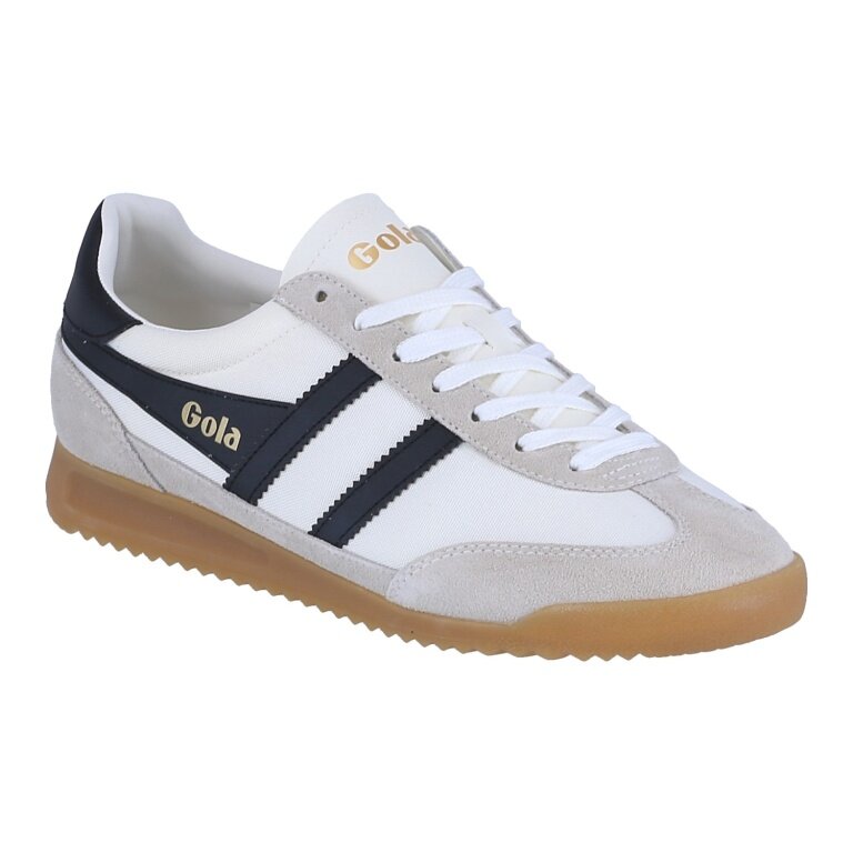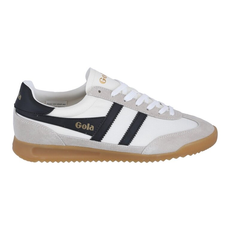 Der Tornado stammt von seinem Gola-Vorfahren aus dem Jahr 1985 ab und verfügt über eine leichte Keilgummisohle und ein Obermaterial aus schwerem, gewebtem Nylon, ergänzt durch eine Wildlederspitze, -ferse und -besätze und wird durch das sägezahnförmige Gola-Wingflash-Branding zu großem „Old-School“-Glanz kontrastiert