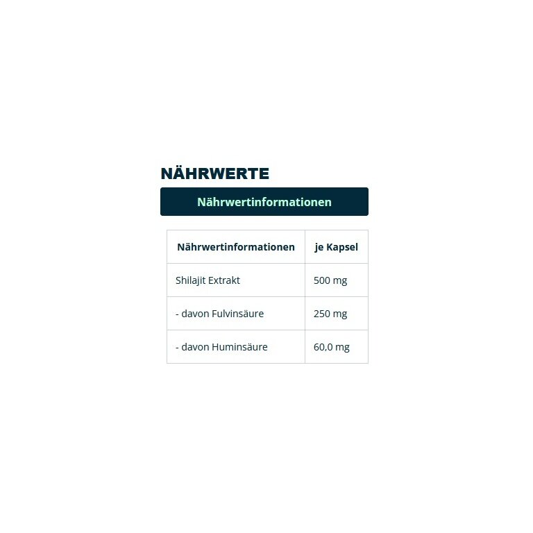 • pro Portion erhältst du 500 mg Premium Shilajit Extrakt mit 50% Fulvinsäure und 12% Huminsäure