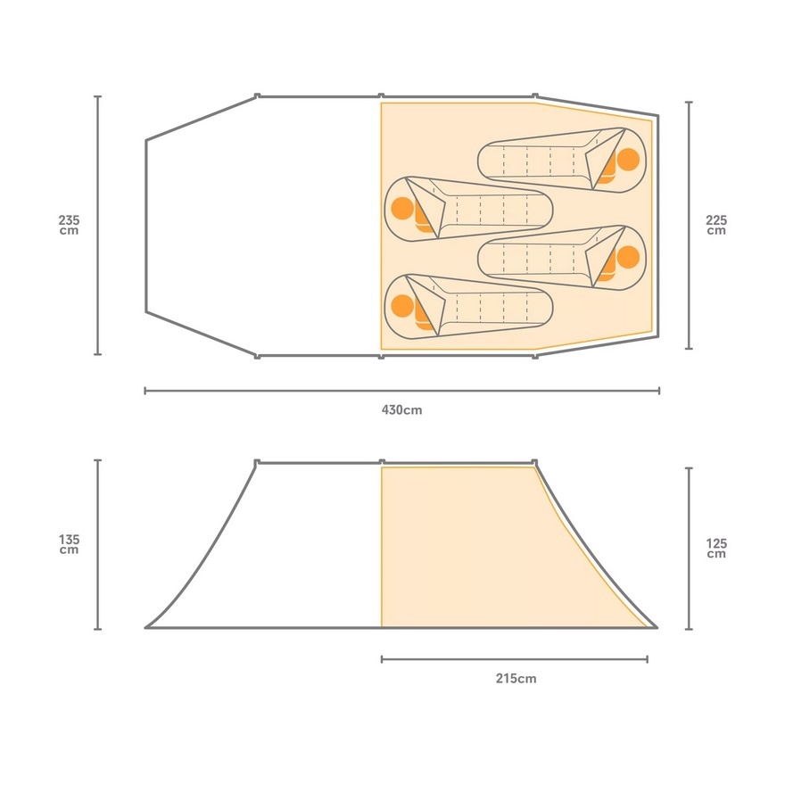 • schnell aufzubauen, mit robusten Leichtmetallstangen und geräumigem Vorbau für Rucksäcke und Schuhe