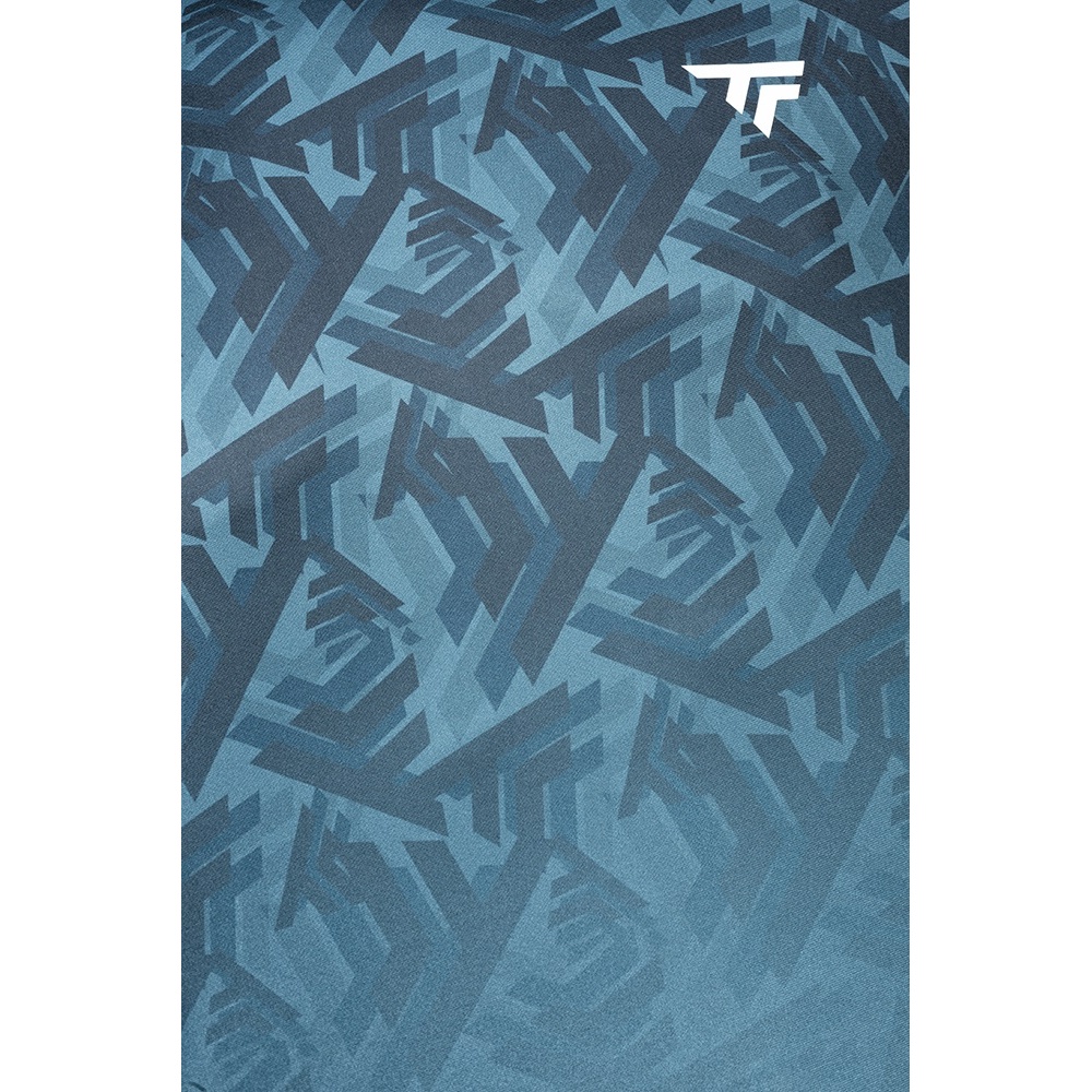 • was das Design betrifft, so verschmilzt die grafische Optik mit dem Material, mit einem abgestuften Raster, das das Wappen von Tecnifibre hervorhebt