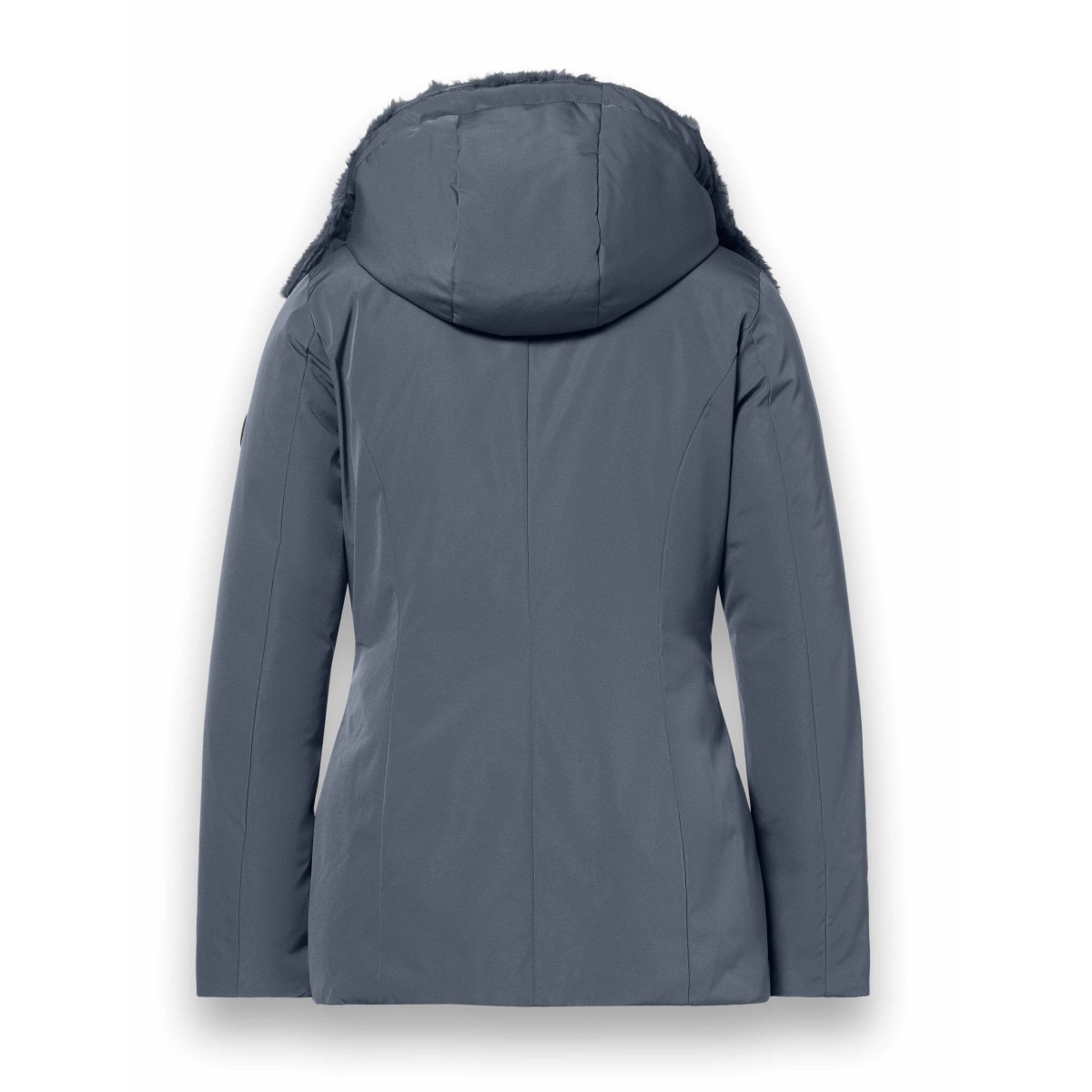 • funktionaler Mantel in mittlerer Länge mit abnehmbarer, verstellbarer Kapuze und Kunstfell-gefüttertem Kragen.