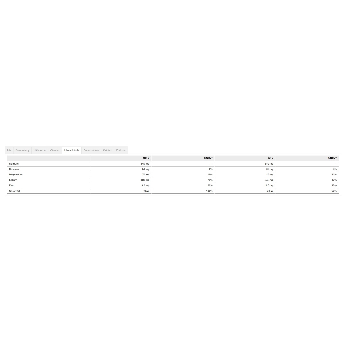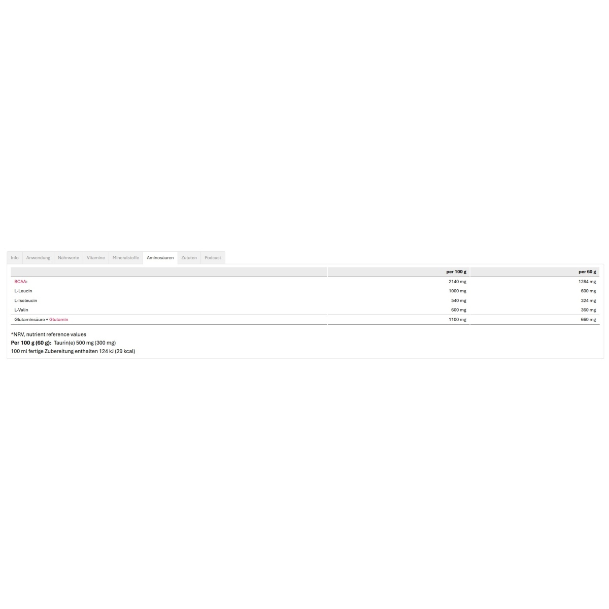 • Zutaten: Glucose, Maltodextrin, Saccharose, Wachsmaisstärkehydrolisat (Vitargo®) 12%, Proteinhydrolysate 12% (Molke, Casein), Isomaltulose*, Trehalose**, Mineralstoffe (Natrium-, Kaliumcitrat, Magnesiumlactat, chromhaltige Nährhefe, Zinklactat), Aromen, Taurin 0.5%, Schwarztee-Extrakt, Vitamine (Ascorbinsäure, Nicotinamid, alpha-Tocopherylacetat, Calciumpantothenat, Pyridoxinhydrochlorid, Riboflavin, Thiaminmononitrat, Folsäure, Biotin, Cyanocobalamin), Farbstoff Zuckerkulör. *Quelle von Glucose und Fructose **Glucosequelle