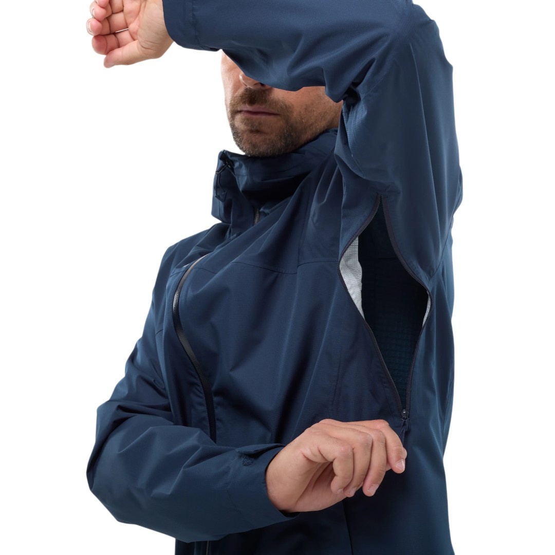 • trotz ihrer 2,5-Lagen-Konstruktion ist sie sehr leicht. Belüftungsreißverschlüsse unter den Armen regulieren die Wärme beim Aufstieg.