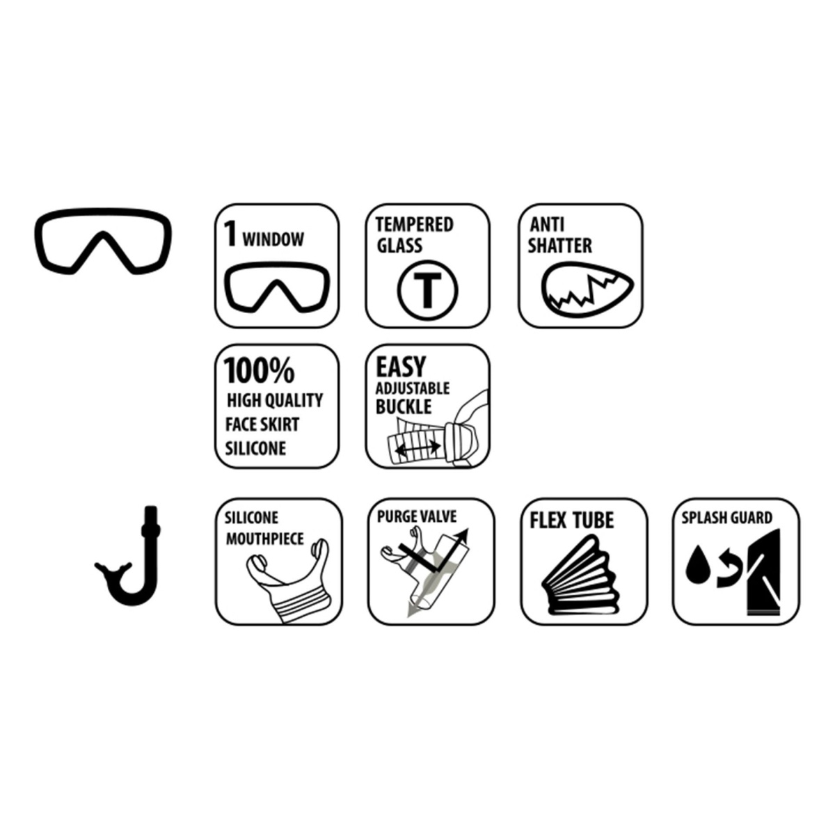 • Lieferumfang: 1x Taucherbrille aus Sicherheits-Glas, 1x Schnorchel mit Esy Clip Halter, Spitzwasserschutz und Ausblasventil
