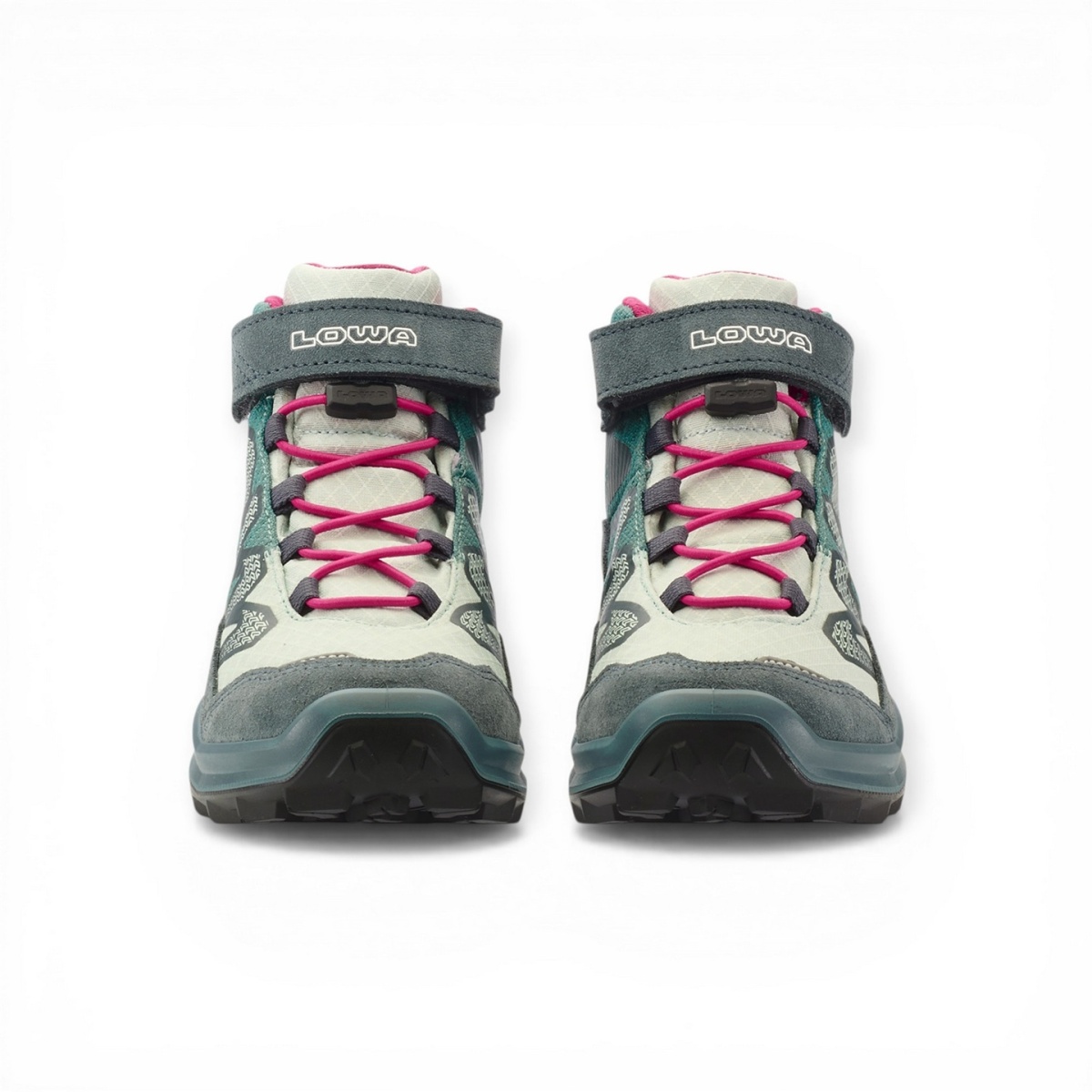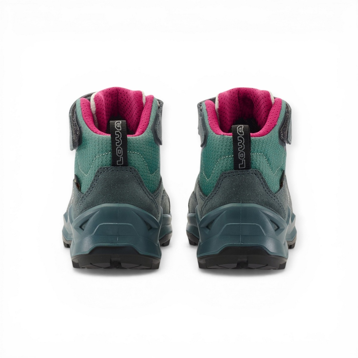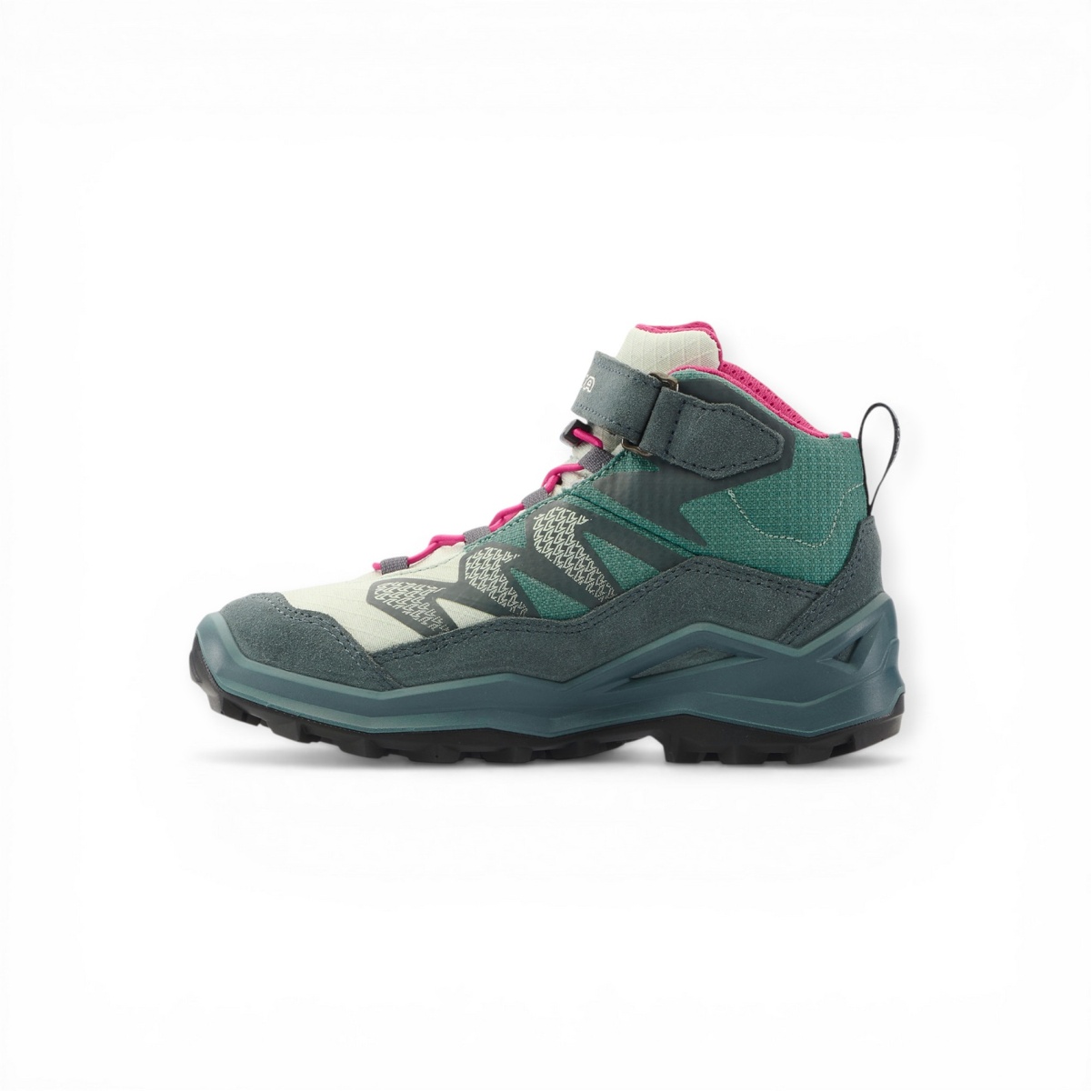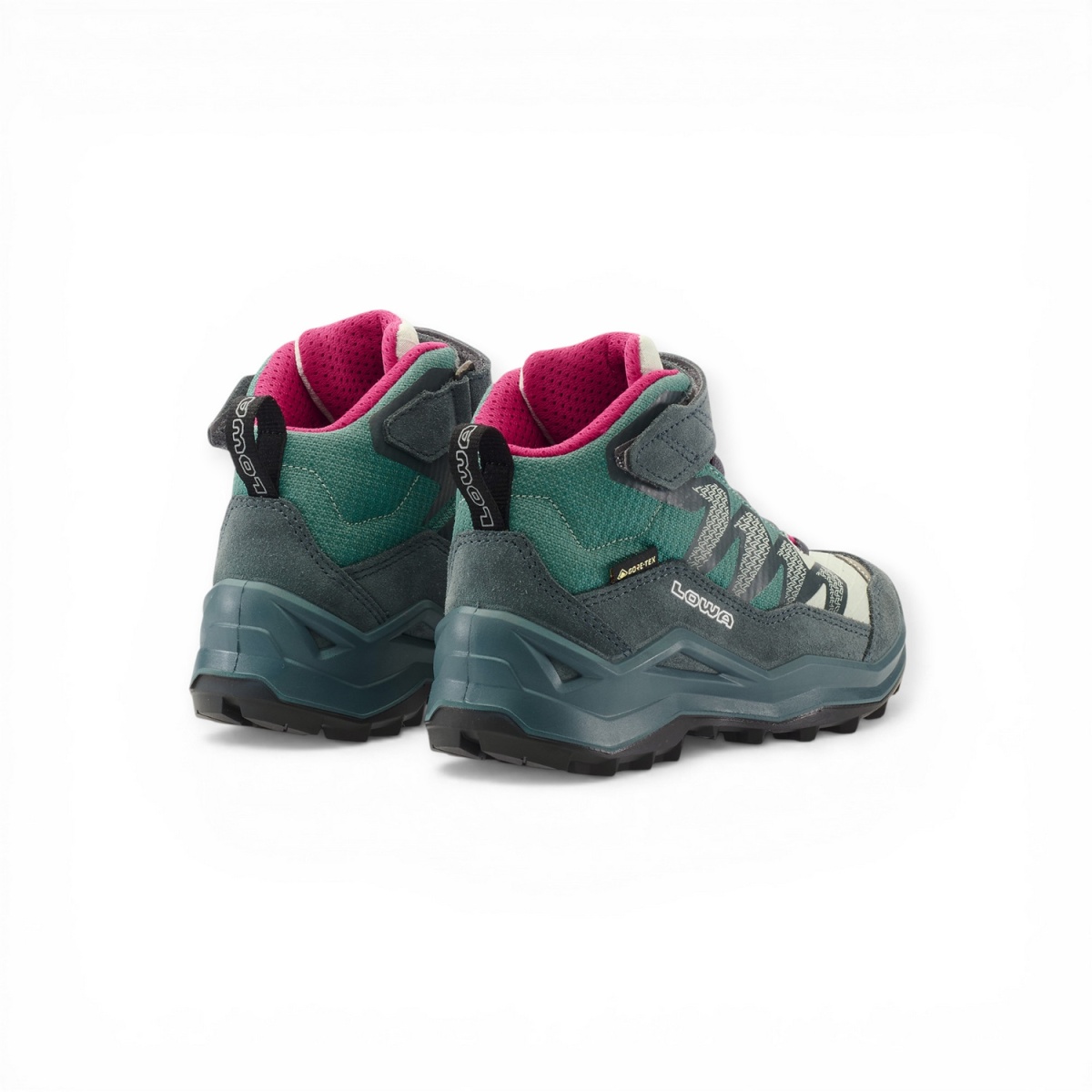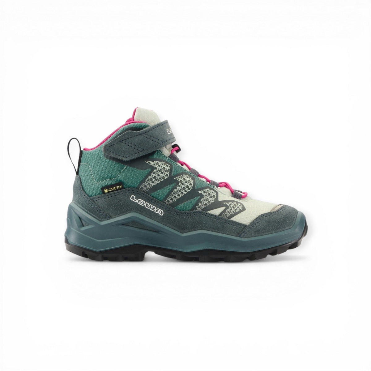 Lowa Wanderschuhe Maddox Pro Mid GTX Velcro Junior (Textil/Veloursleder, Klett­ver­schluss, wasserdicht) petrol/pink Kinder