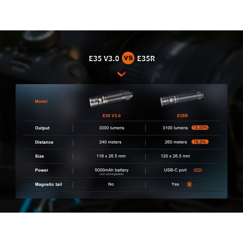 • die Fenix E35R EDC-Taschenlampe ist der Nachfolger der Fenix E35 V3.0 Taschenlampe