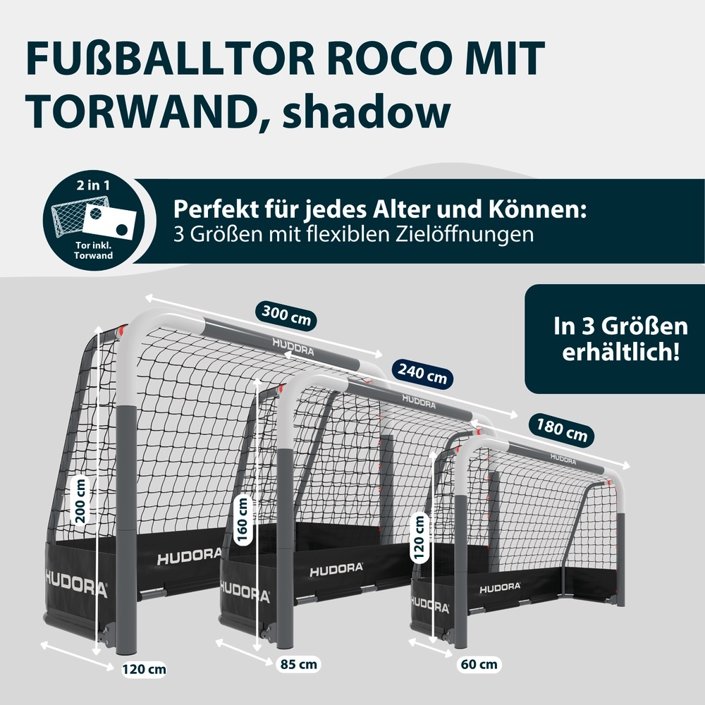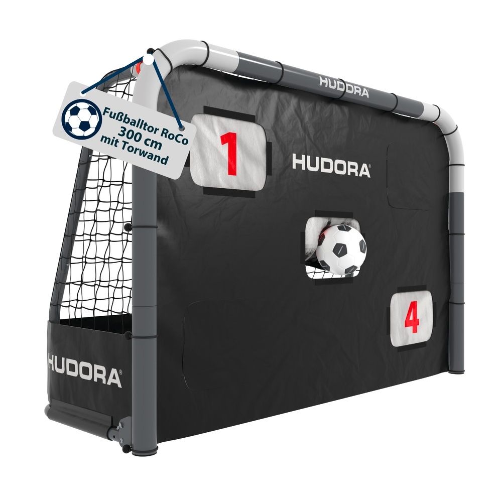 Hudora Fussballtor RoCo 300 mit Torwand (hochwertig, stabile Netz- und Bodenverankerung, Punktzähler) schwarz - 300x200x120cm